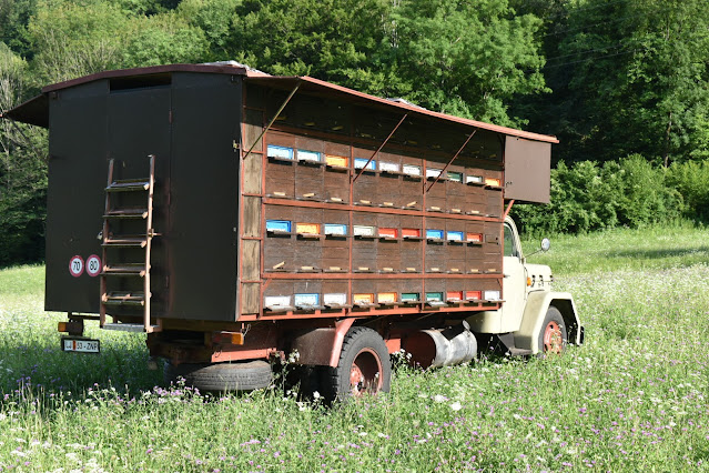 We saw several bee trucks. This one holds 60 hives. There were also many traditional Slovene bee houses, and some little places with just a few hives. The fields were full of bees!